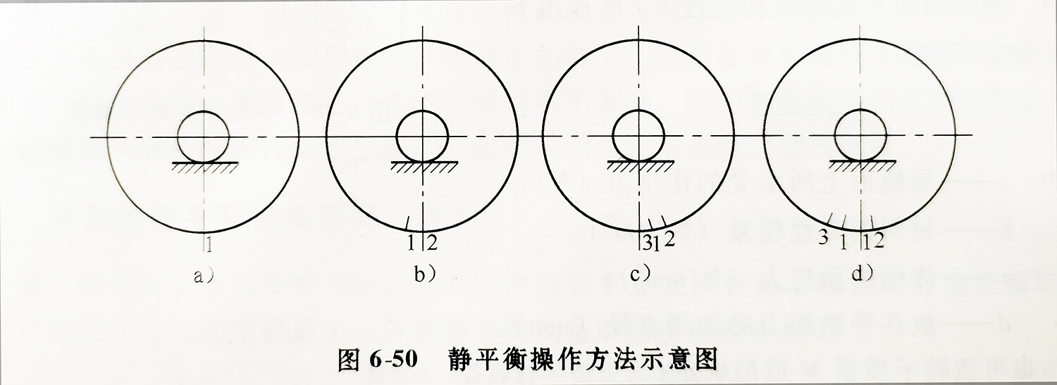 怎樣校正風機轉(zhuǎn)子的靜平衡?導軌式靜平衡機是一種靈敏度較高、結(jié)構(gòu)簡單、操作方便、使用普遍的設(shè)備,以它為例,來說明校正鳳機轉(zhuǎn)子的靜平衡操作方法。將轉(zhuǎn)子輕放在平衡機的軌道上(或圓盤夾角內(nèi)),使轉(zhuǎn)子水平軸線垂直于軌道軸線。用手扳動轉(zhuǎn)子,使其任意停止。在轉(zhuǎn)子下面作一標記“1”,如圖6-50a。為了消除摩擦阻力矩誤差,將轉(zhuǎn)子旋轉(zhuǎn)90°使標記“1”與轉(zhuǎn)子中心線成水平位置,然后放開,待停止擺動后,在此刻轉(zhuǎn)子的最下面作標記“2”,如圖6-50b。再將轉(zhuǎn)子向相反方向轉(zhuǎn)90°,同樣使標記“1”與轉(zhuǎn)子中心線成水平位置,放開,待擺動停止后,在此刻轉(zhuǎn)子的最下面作標記“3”, 如圖6-50c。如果標記“1”、 “2”、“3”點相重合,則偏重位置就在重合點處,否則,偏重位置就在標記“2”與“3”的中間,如圖6 -50d。
