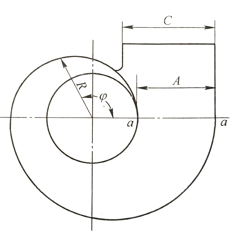 蝸殼的主要參數是蝸殼的寬度B及其內壁形線。蝸殼的寬度B (見圖2-8中截面a-a稱為螺旋終了截面,A稱為螺旋終了截面的張開度)的選取十分重要,寬度B與張開度(擴張度) A有著直接關系,如果改變B,需相應改變A,使擴張當量面積(Fk) 不變,即:Fk=A*B=A1*B1=A2*B2.