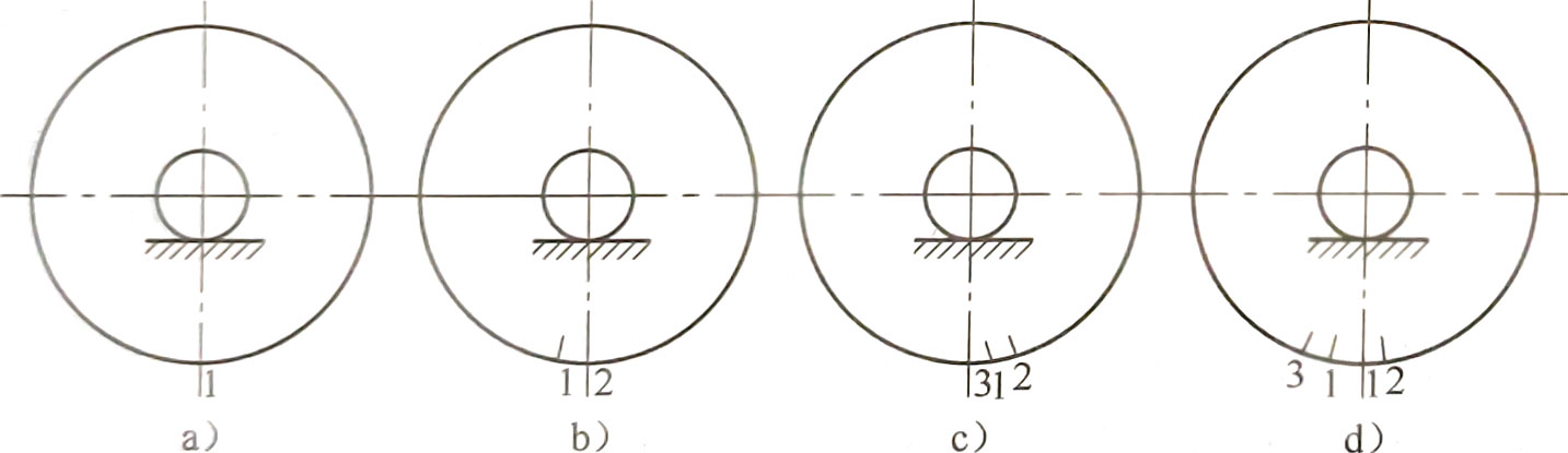 將離心通風(fēng)機(jī)轉(zhuǎn)子輕放在平衡機(jī)的軌道上(或圓盤夾角內(nèi)),使轉(zhuǎn)子水平軸線垂直于軌道軸線。用手扳動轉(zhuǎn)子,使其任意停止。在轉(zhuǎn)子下面作一標(biāo)記“1”,如圖a。為了消除摩擦阻力矩誤差,將轉(zhuǎn)子旋轉(zhuǎn)90°使標(biāo)記“1”與轉(zhuǎn)子中心線成水平位置,然后放開,待停止擺動后,在此刻轉(zhuǎn)子的最下面作標(biāo)記“2”,如圖b。再將轉(zhuǎn)子向相反方向轉(zhuǎn)90,同樣使標(biāo)記“1”與轉(zhuǎn)子中心線成水平位置,放開,待擺動停止后,在此刻離心通風(fēng)機(jī)轉(zhuǎn)子的最下面作標(biāo)記“3”,如圖c。如果標(biāo)記“1”、“2”、“3”點(diǎn)相重合,則偏重位置就在重合點(diǎn)處,否則,偏重位置就在標(biāo)記“2”與“3”的中間,如圖d。