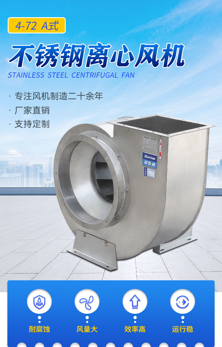 4-72型離心通風(fēng)機(jī)可作為一-般工廠及大型建筑物的室內(nèi)通風(fēng)換氣用,輸送空氣 和其它不自燃的、對人體無害的、對鋼材無腐蝕性的氣體。氣體內(nèi)不允許含有黏性 物質(zhì),所含塵土及硬質(zhì)顆粒物不大于150mg/m3。氣體溫度不得超過80°C。F4-72 型風(fēng)機(jī)采用不銹鋼、玻璃鋼、PP料等材質(zhì),用于輸送腐蝕性氣體,其性能及地基 尺寸與4-72型相同。