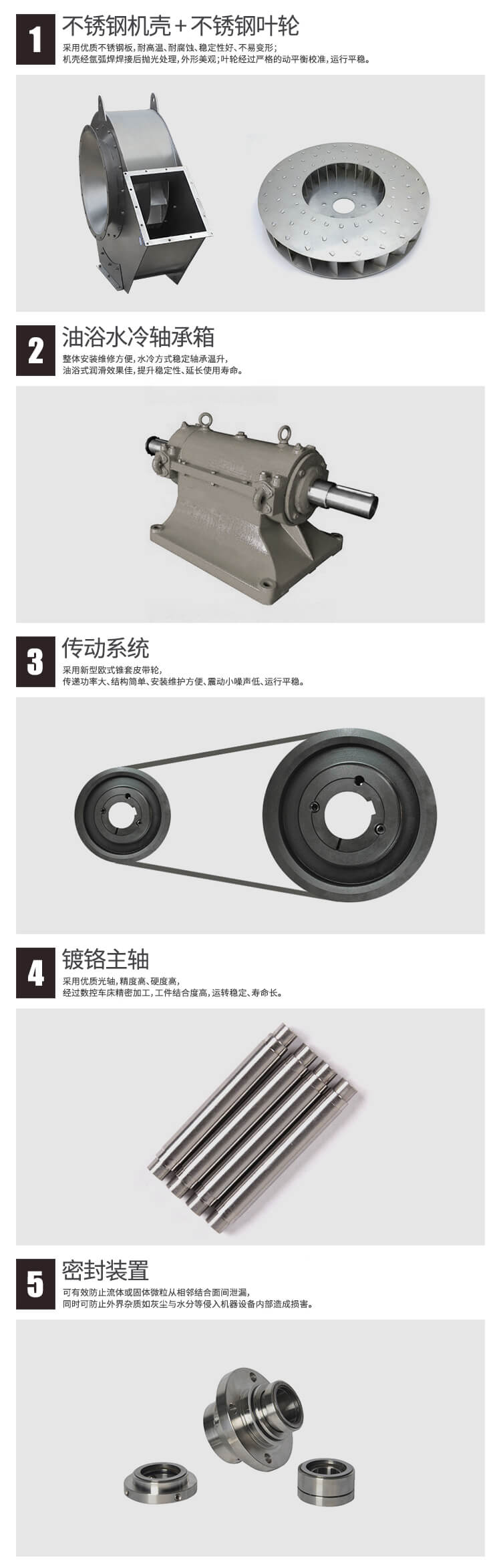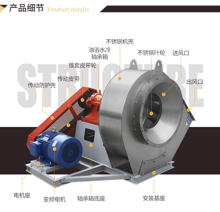 外殼及風(fēng)輪采用不銹鋼風(fēng)機(jī)材質(zhì)焊接而成,耐高溫,能有效防酸堿、防腐蝕