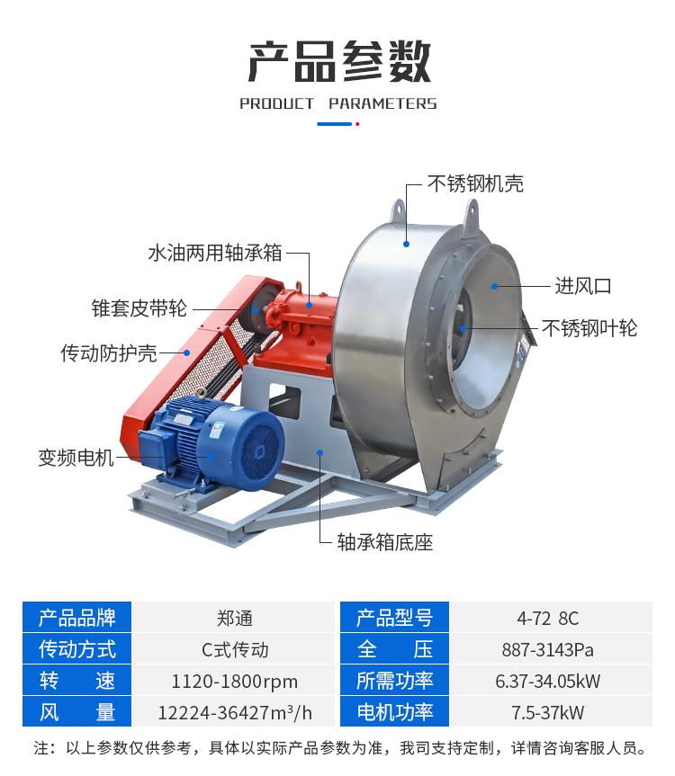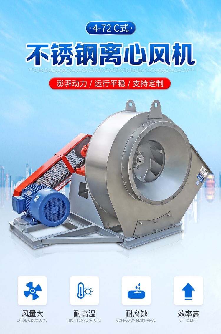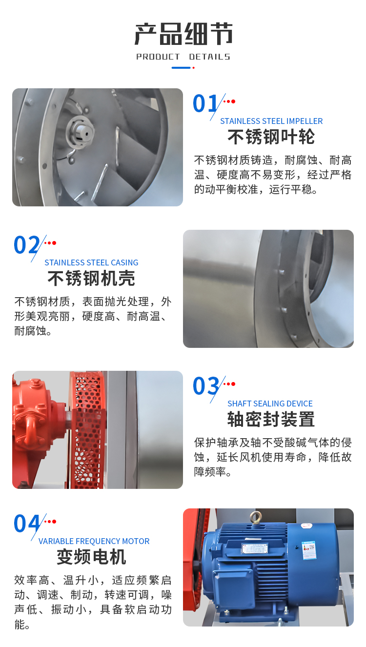 外殼及風(fēng)輪采用不銹鋼風(fēng)機(jī)材質(zhì)焊接而成,耐高溫,能有效防酸堿、防腐蝕