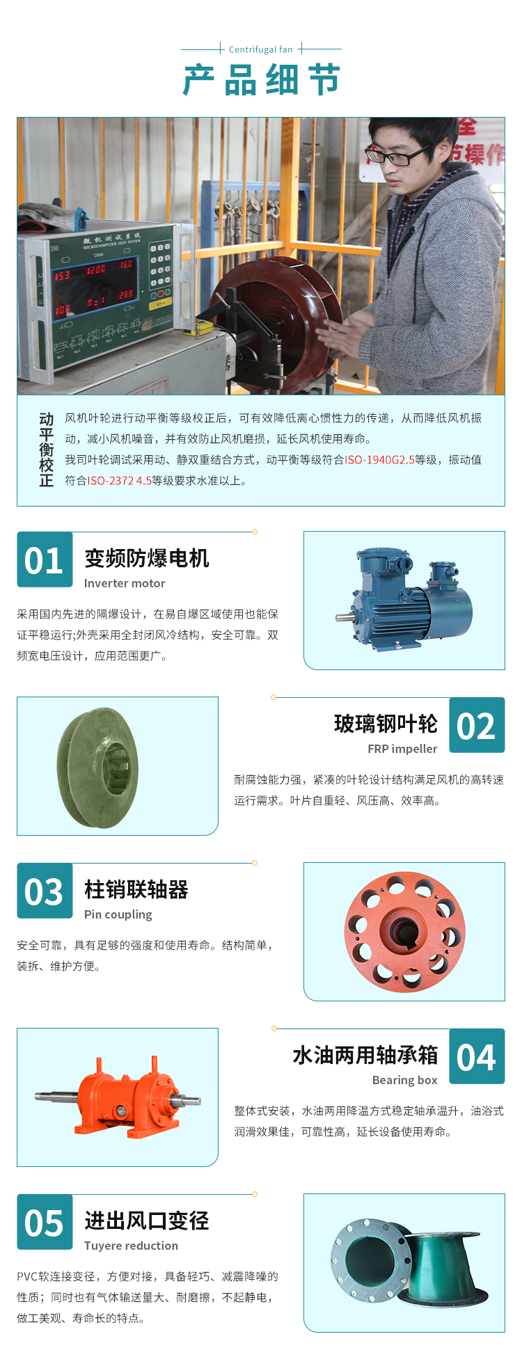 主要由玻璃鋼材質(zhì)制成,大機(jī)號(hào)也可以制成皮帶驅(qū)動(dòng),耐腐蝕性好、不易老化。噪聲低、重量輕。