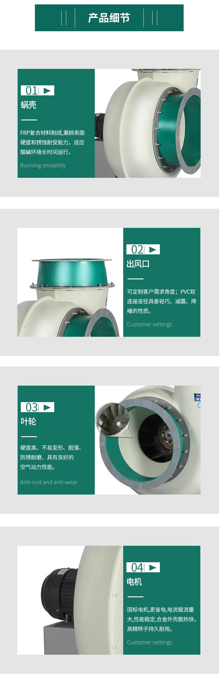 適用于化工廠、紡織、電鍍、實(shí)驗(yàn)室等場所排送含有一定濃度的酸、堿、鹽等腐蝕性氣體,也可以作為一般工廠的建筑物通風(fēng)換氣用