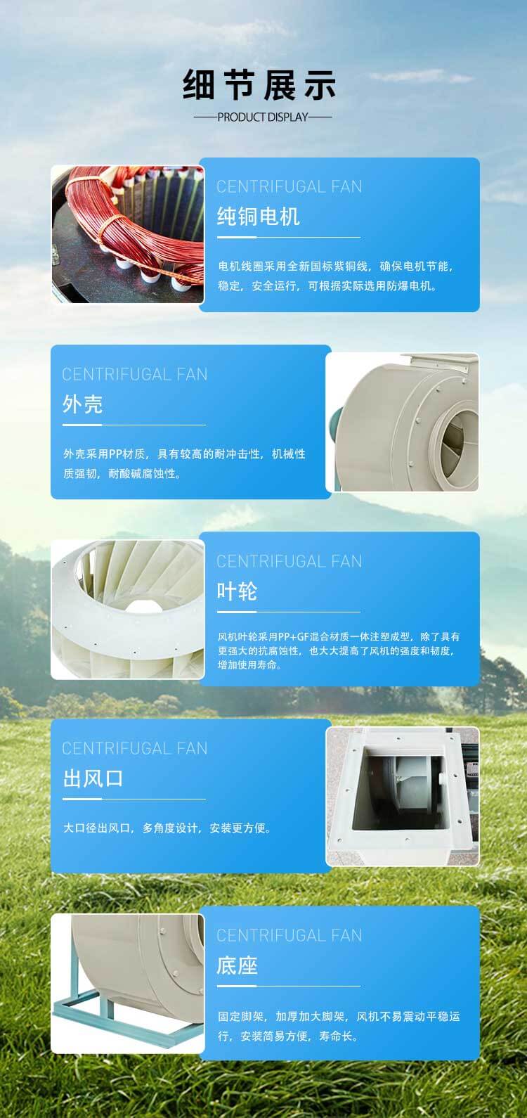 適用于化工、紡織、電鍍、實驗室等場所排送含有一定濃度的酸、堿、鹽等腐蝕性氣體,也可以作為一般工廠的建筑物通風(fēng)換氣用