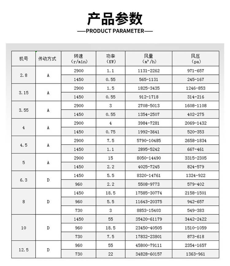 主要由玻璃鋼材質(zhì)制成,大機號也可以制成皮帶驅(qū)動,耐腐蝕性好、不易老化。噪聲低、重量輕。