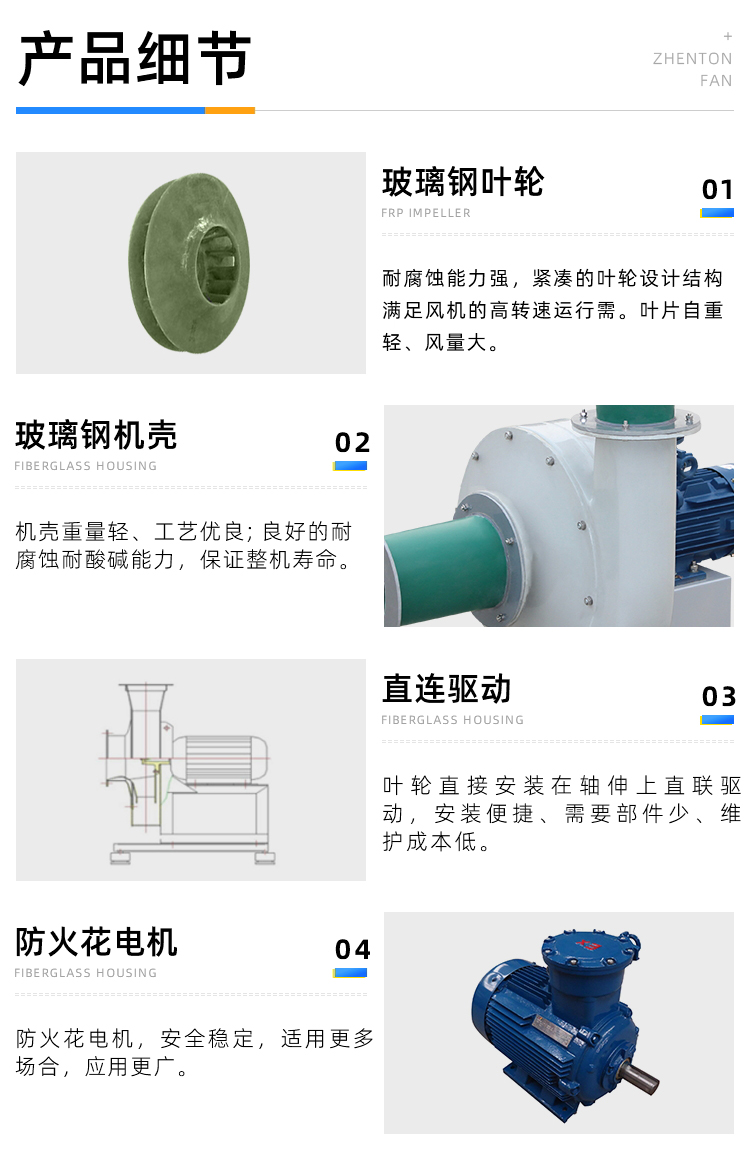 要由玻璃鋼材質制成,大機號也可以制成皮帶驅動,耐腐蝕性好、不易老化。噪聲低、重量輕