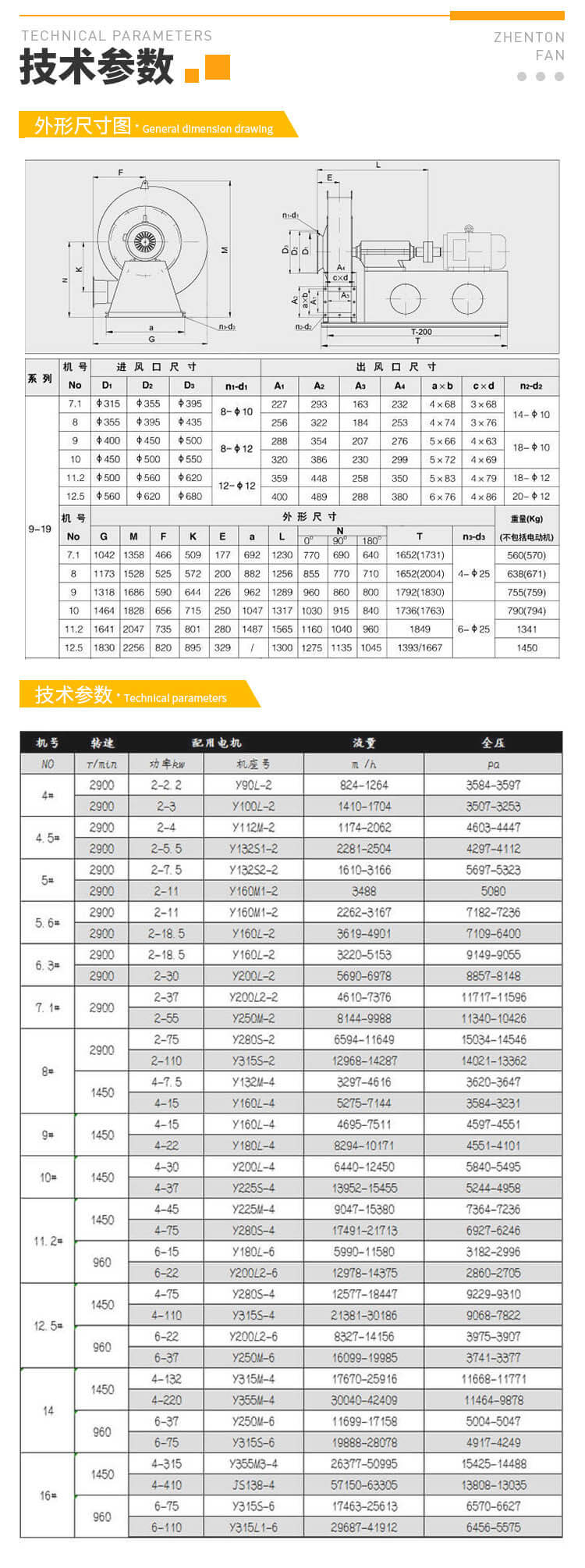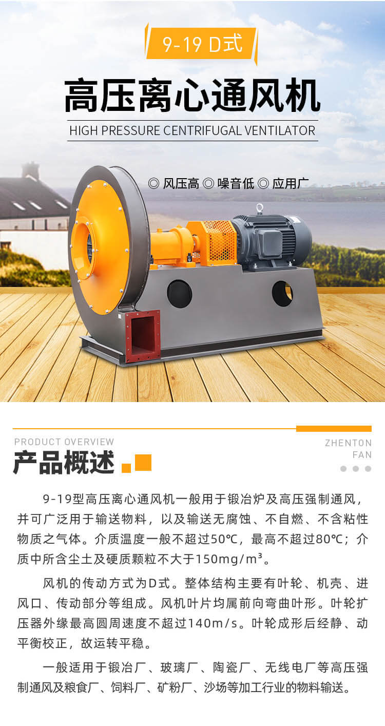 9-19型高壓離心通風(fēng)機(jī)一般用于 鍛冶爐及高壓強(qiáng)制通風(fēng), 并可廣泛用于輸送物料,以及輸送無腐蝕、不自燃、不含粘性 物質(zhì)之氣體。介質(zhì)溫度一般不超過50°C,最高不超過80°C;介 質(zhì)中所含塵土及硬質(zhì)顆粒不大于150mg/m 。