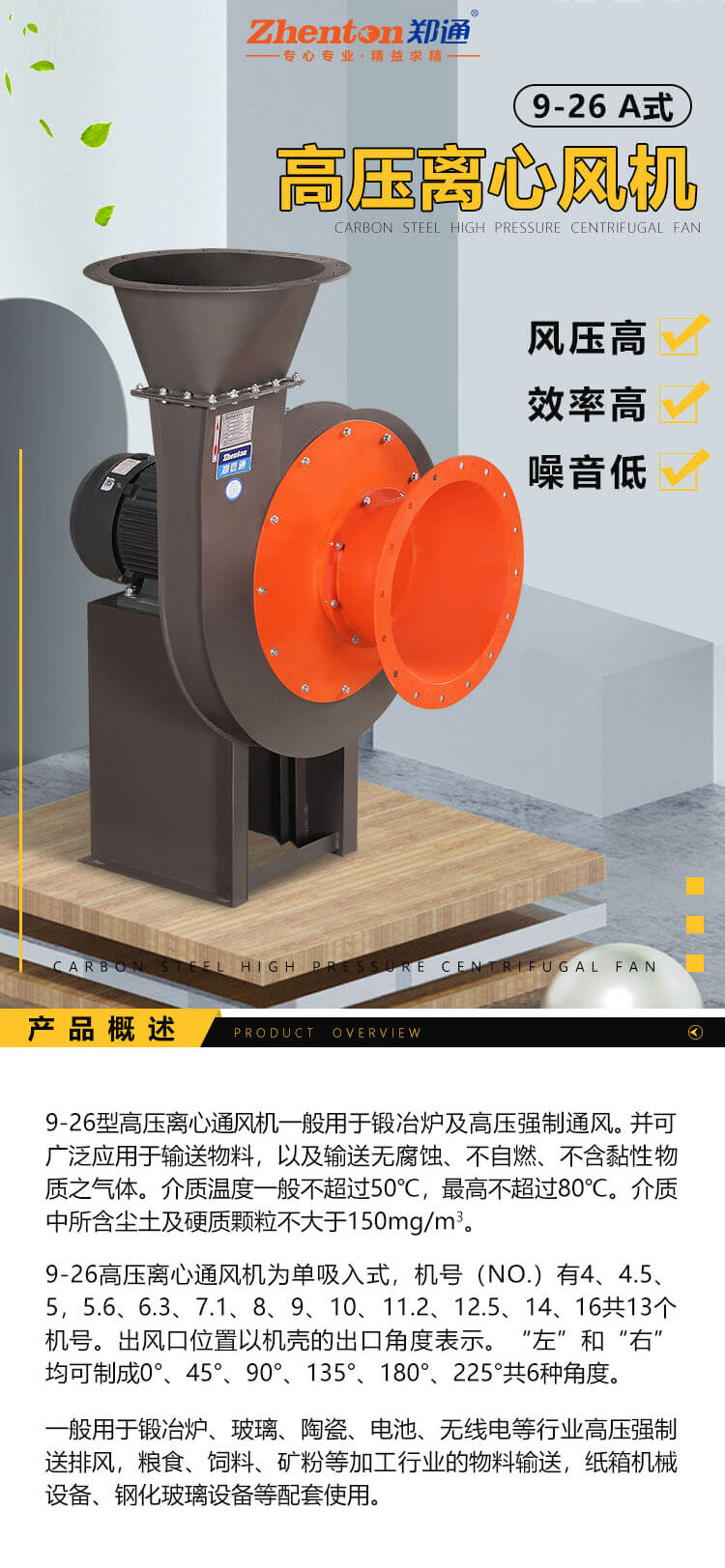 9-26型高壓離心通風(fēng)機(jī)一般用于鍛冶爐及高壓強(qiáng)制通風(fēng)。并可廣泛應(yīng)用于輸送物料,以及輸送無腐蝕、不自燃不含黏性物質(zhì)之氣體。介質(zhì)溫度一般不超過50°C, 最高不超過80°C。介質(zhì)中所含塵土及硬質(zhì)顆粒不大于150mg/m3。