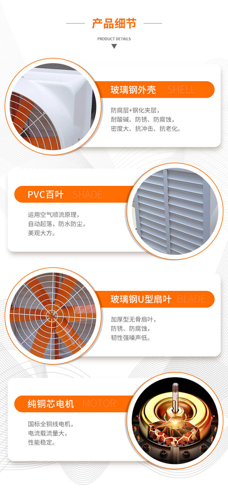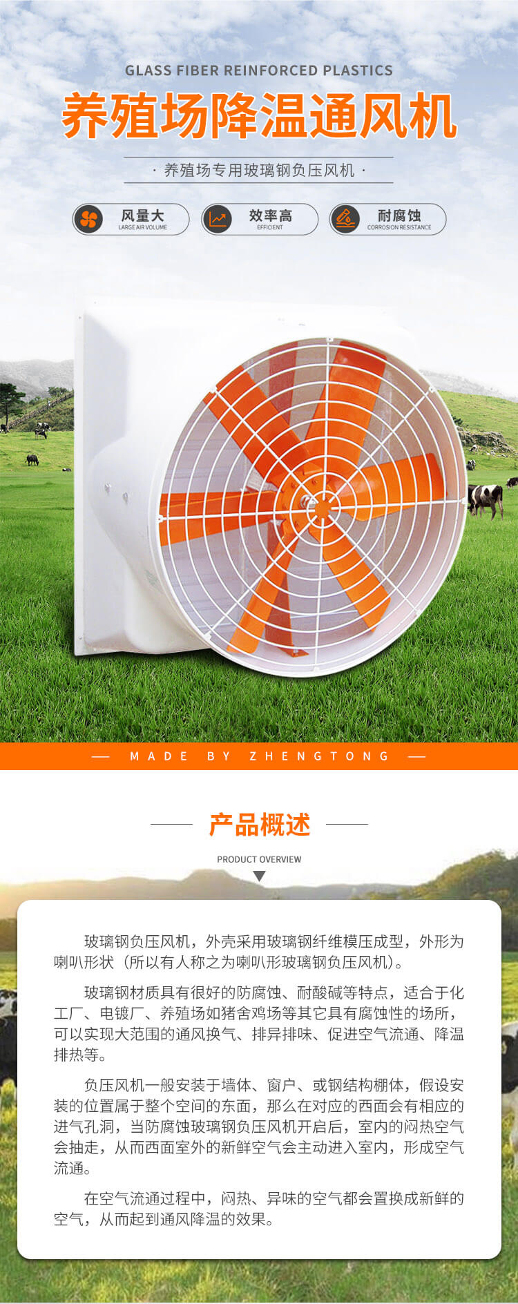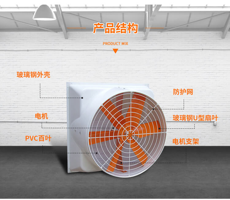 玻璃鋼材質(zhì)具有很好的防腐蝕、耐酸堿等特點(diǎn),適合于化工廠、電鍍廠、養(yǎng)殖場(chǎng)如豬舍雞場(chǎng)等其它具有腐蝕性的場(chǎng)所,可以實(shí)現(xiàn)大范圍的通風(fēng)換氣、排異排味、促進(jìn)空氣流通、降溫排熱等。