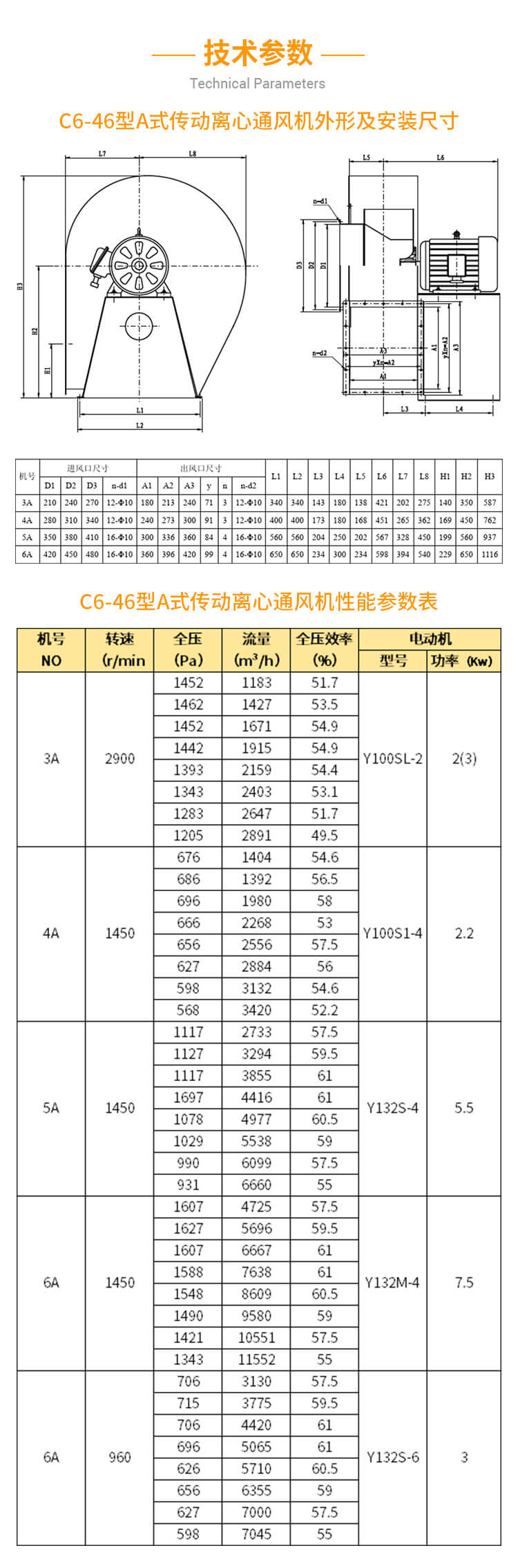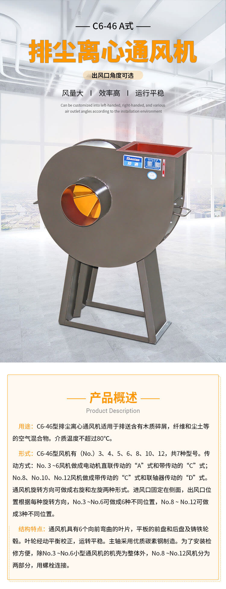 C6-46型排塵離心通風(fēng)機(jī)適用于排送含有木質(zhì)碎屑,纖維和塵土等的空氣混合物。介質(zhì)溫度不超過80°C。