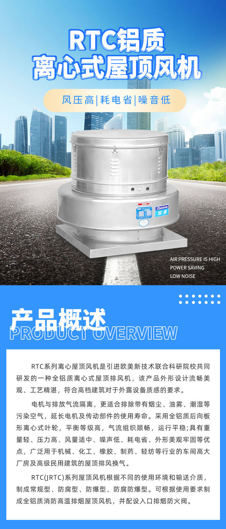 RTC系列離心屋頂風機是引|進歐美先進技術(shù)聯(lián)合科研院校共同研發(fā)的一種全鋁質(zhì)離心式屋頂排風機,該產(chǎn)品外形設計流暢美觀,工藝精湛,符合高檔建筑對于外露設備質(zhì)感的要求。