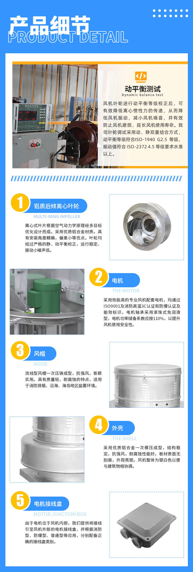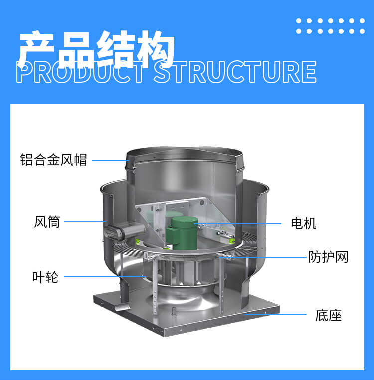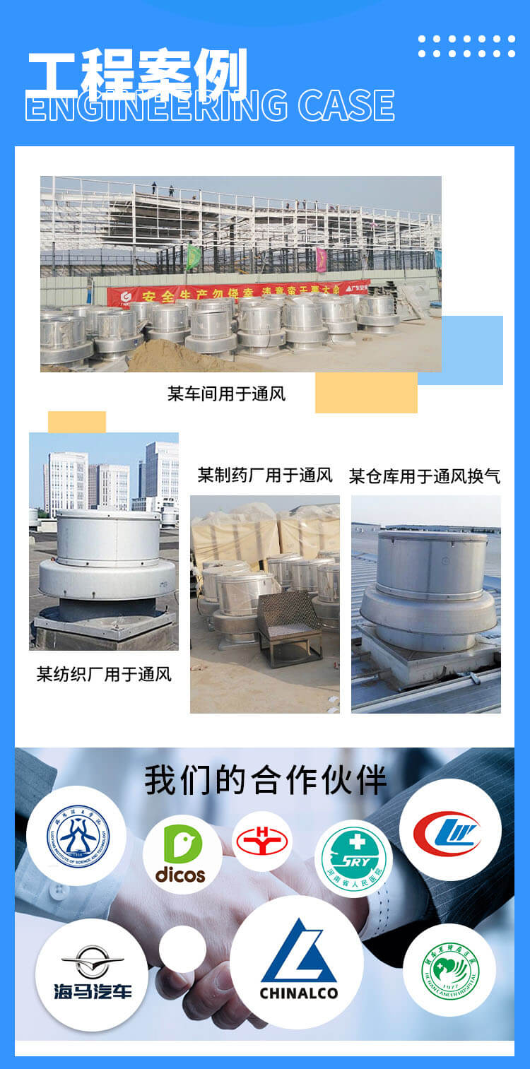 電機與排放氣流隔離,更適合排除帶有煙塵、油霧、潮濕等污染空氣,延長電機及傳動部件的使用壽命。采用全鋁質(zhì)后向板形離心式葉輪,平衡等級高,氣流組織順暢,運行平穩(wěn);具有重量輕、壓力高、風量適中、噪聲低、耗電省、外形美觀牢固等優(yōu)點,廣泛用于機械、化工、橡膠、制藥、輕紡等行業(yè)的車間高大廠房及高級民用建筑的屋頂排風換氣。