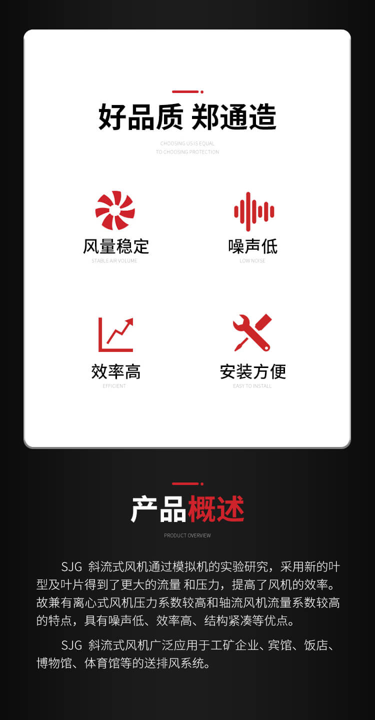 SJG斜流風(fēng)機(jī)廣泛應(yīng)用于工業(yè)及民用建筑等各種通風(fēng)換氣場(chǎng)所,特別使用于通風(fēng)與空調(diào)管道的加壓、送風(fēng)和排風(fēng)