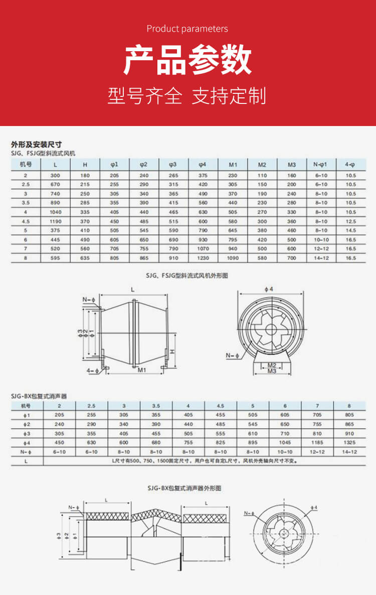 SJG斜流風(fēng)機(jī)應(yīng)用斜流子午加速設(shè)計(jì)方法,兼有離心式風(fēng)機(jī)壓力系數(shù)較高 和軸流式風(fēng)機(jī)流量系數(shù)較大的特點(diǎn),具有噪聲低、耗電省、結(jié)構(gòu)緊湊等優(yōu)點(diǎn)