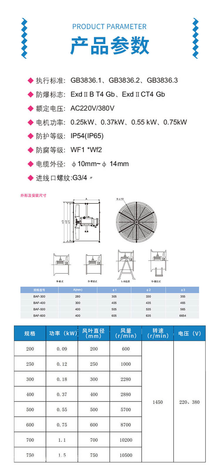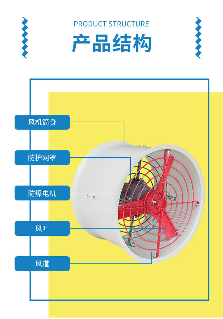 BAF防爆軸流風(fēng)機(jī)由防爆電機(jī)、風(fēng)葉、風(fēng)筒等部分組成,葉片由鋁板制成,風(fēng)筒用鋼板與型材加工焊接而成,電源引線用鋼管布線和電纜布線均可,殼外設(shè)有接地螺釘